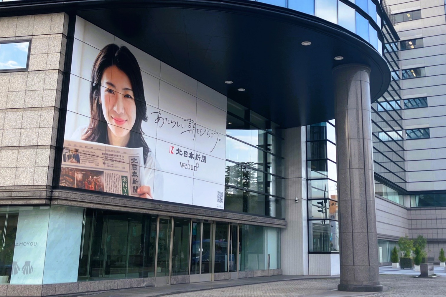 北日本新聞社はこのたび、高岡市出身の俳優、瀧内公美さんをブランドアンバサダーにお迎えしました。テレビCMやウェブメディアなど、さまざまな形で当社事業をPRしていただきます。4月14日には、富山市安住町の本社玄関前に屋外広告も設置しました。