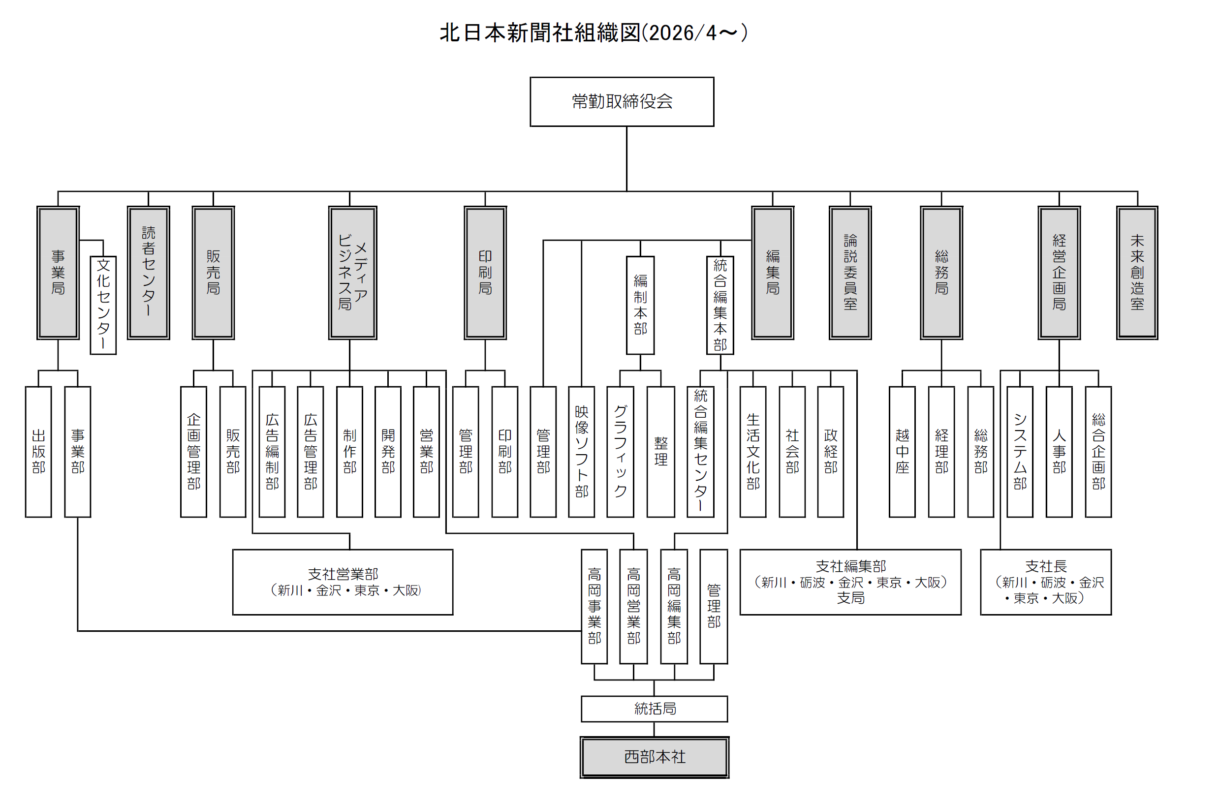 北日本新聞社は2026年4月1日付で機構改革を行いました。社長直轄の未来創造室を新設し、地域振興に寄与する次世代事業に取り組みます。