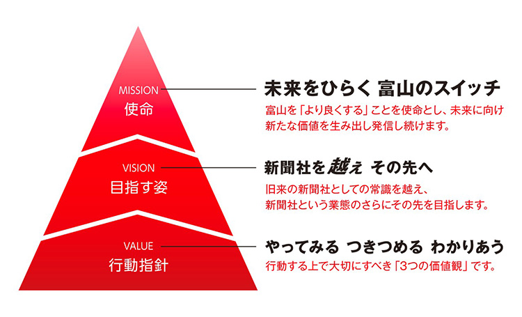 北日本新聞社は2026年4月、MVV(ミッション・ビジョン・バリュー)を策定し、公表しました。社会が大きく変わる今、「これからの新聞社はどうあるべきか」を見つめ直し、チームが同じ方向を向くための合言葉である MVVを掲げて新たな歩みを始めます。