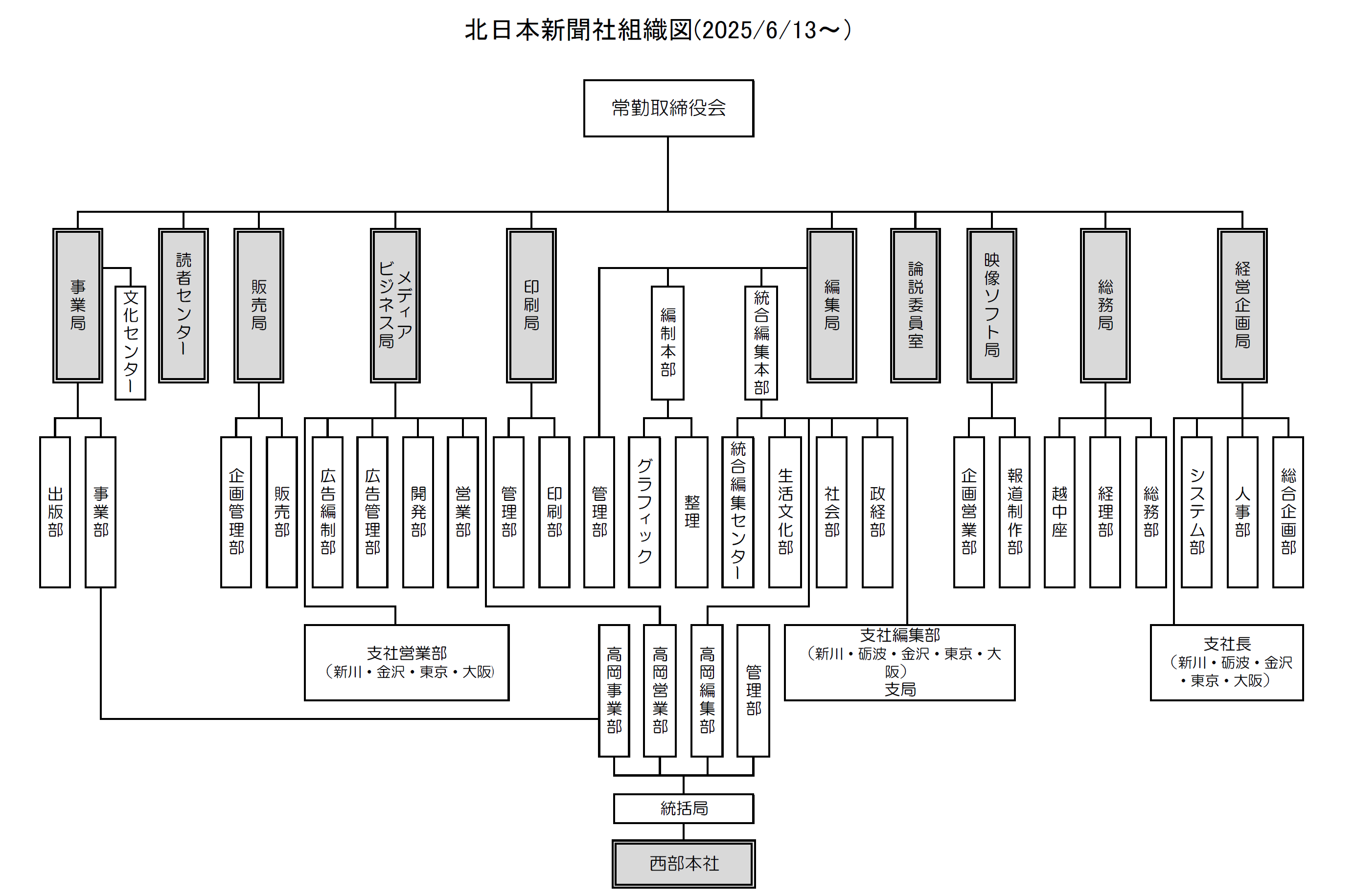 本社機構は経営企画、総務、映像ソフト、編集、印刷、メディアビジネス、販売、事業の各局と論説委員室、読者センターで構成。富山県内に西部本社と新川、砺波の両支社、10の支局を設けています。このほか金沢、東京、大阪に支社があります。